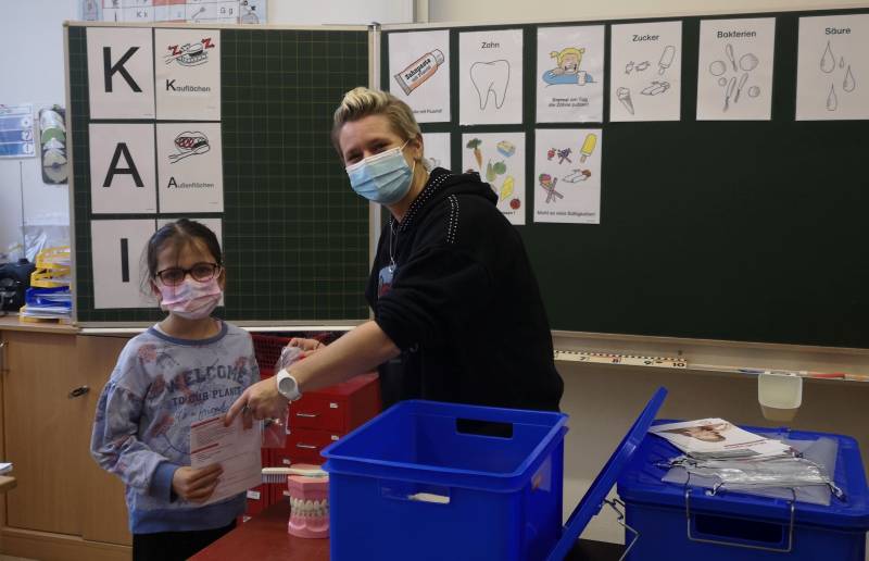 Üben konnten die Kinder weben "Corona" nicht in der Schule. Dafür bekamen Sie aber eine "Putzausstattung" für zu Hause.