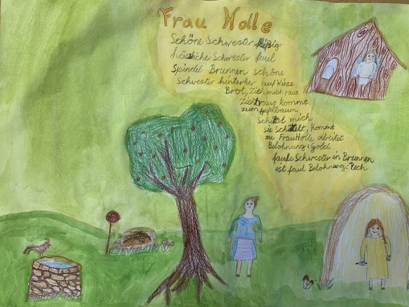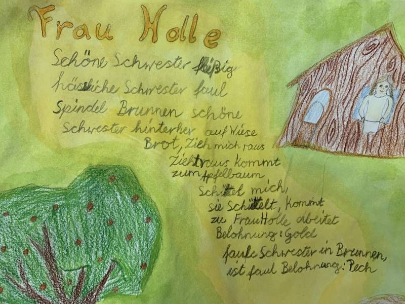 Die Kinder der vierten Klassen sind richtige Märchenexperten geworden, haben viele Märchen kennengelernt, Kriterien erarbeitet und sogar eigene Märchen geschrieben. Im Kunstunterricht haben sie sich dazu passend kreativ mit dem Thema auseinandergesetzt und "Märchen in Stichworten" auf passendem Hintergrund erstellt.
