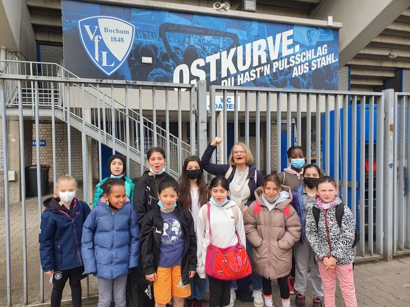 Am 05. Mai machten sich elf aufgeregte Mädchen auf den Weg zu der Sportplatzanlage „Krümmede“. Endlich durfte - nach coronabedingter Pause - wieder ein Turnier stattfinden, bei dem die Waldschule nicht fehlen durfte. Um ein wenig „Profiluft“ zu schnuppern, nahmen wir einen kleinen Umweg in Kauf und schauten am Vonovia Ruhrstadion vorbei. Tatsächlich hatten wir das Glück, dass das Tor zum Stadion geöffnet war und die Waldschulmädels auf dem VfL-Rasen erste Runden drehen konnten. Nach einer kleinen Pause auf den Stadionsitzen ging es dann weiter zu unserem Turnierplatz.