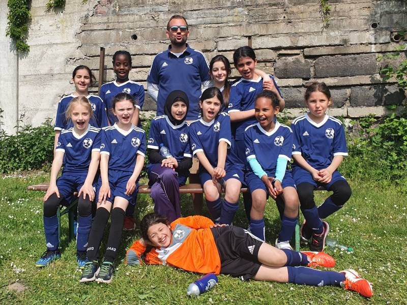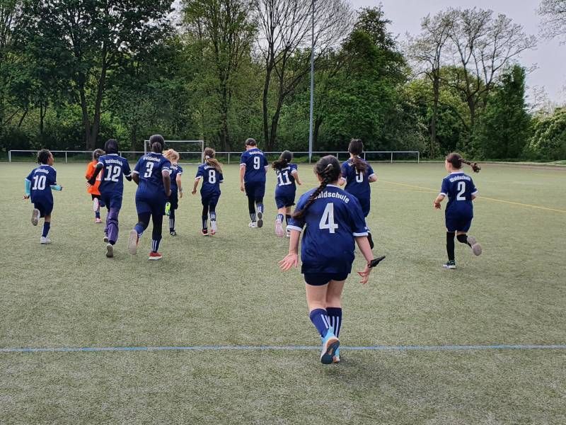 Dort angekommen waren die nagelneuen Waldschul-Fußballtrikots schnell angezogen, nur das Anziehen der Stutzen stellte für unsere Mädels eine Herausforderung dar.