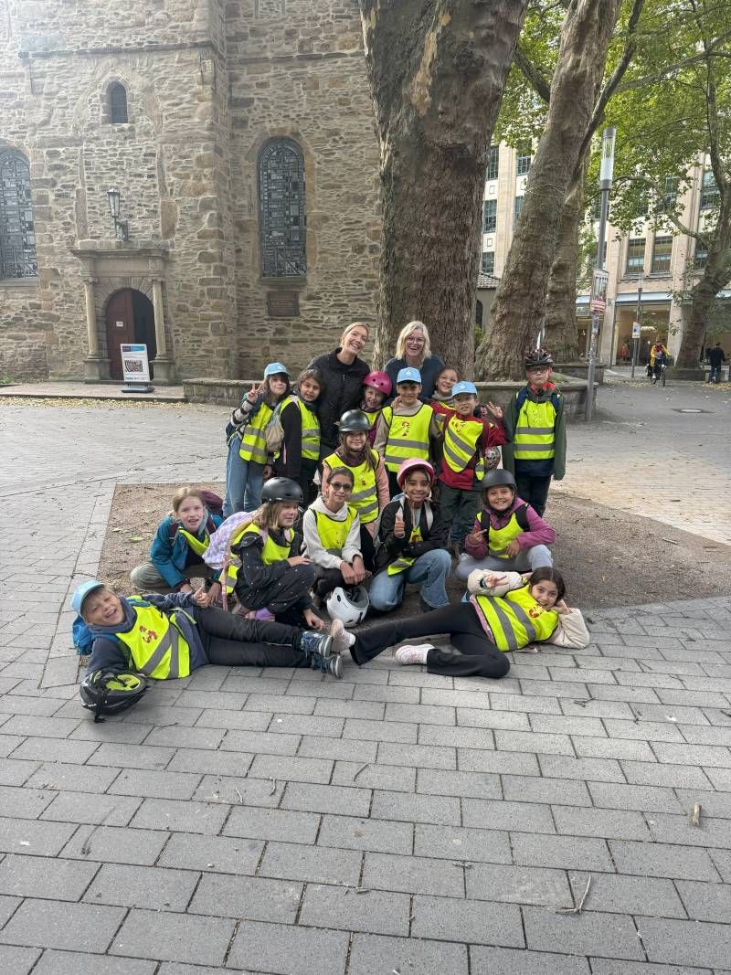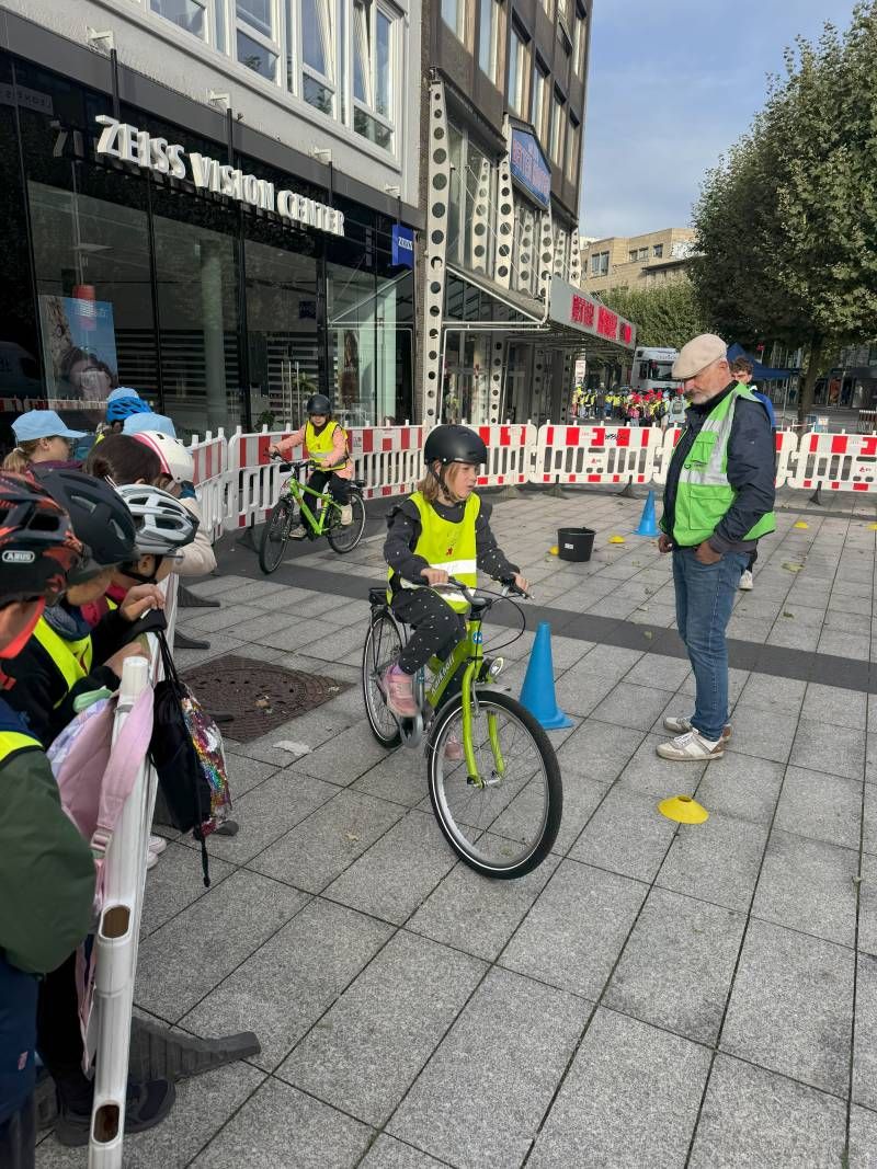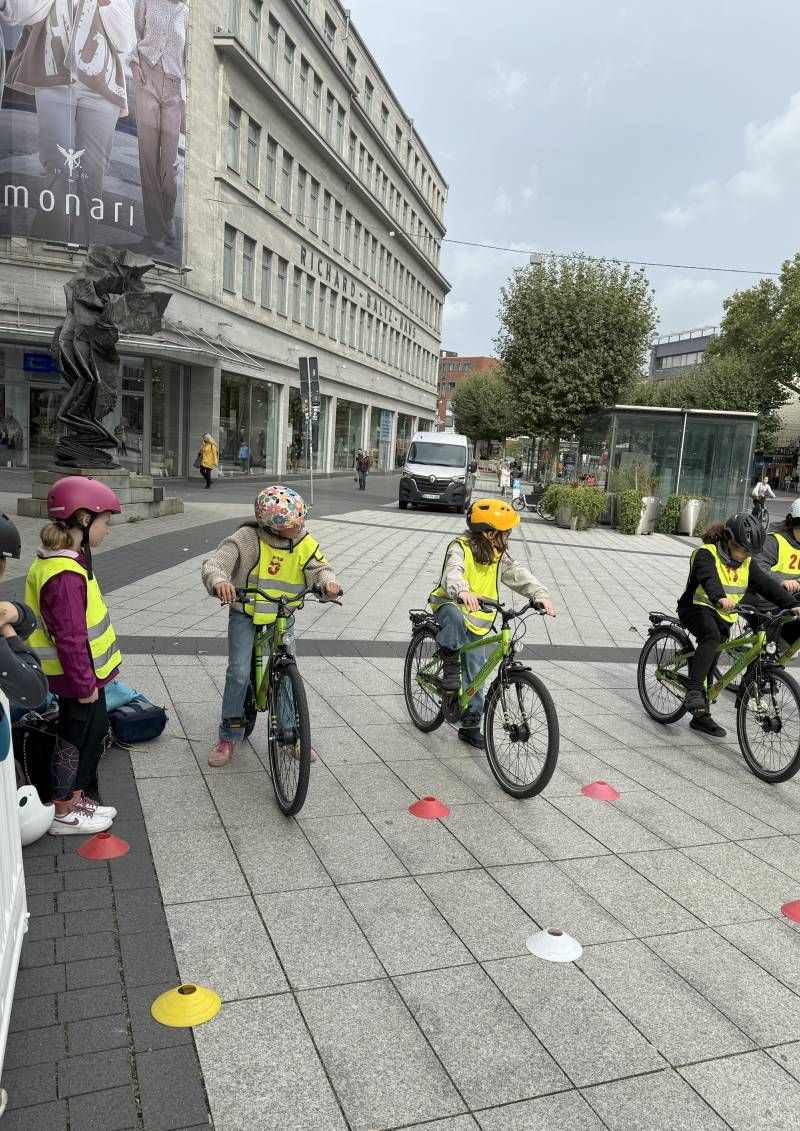 Am 17.09.2025 durften einige Kinder der 4. Klasse der Waldschule an der VerkehrsMeile in der Bochumer Innenstadt teilnehmen. Organisiert von der Verkehrswacht Bochum und der Stadt Bochum standen sieben abwechslungsreiche Stationen bereit, an denen die Schülerinnen und Schüler ihr Können auf dem Fahrrad sowie ihr Wissen rund um die Verkehrssicherheit unter Beweis stellen konnten.